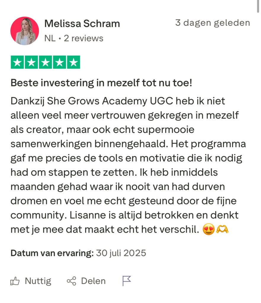 Binnen de She Grows Academy ontdekken vrouwen hoe ze samen succesvol kunnen worden met bewezen strategieën als UGC Creator en andere online verdienmodellen